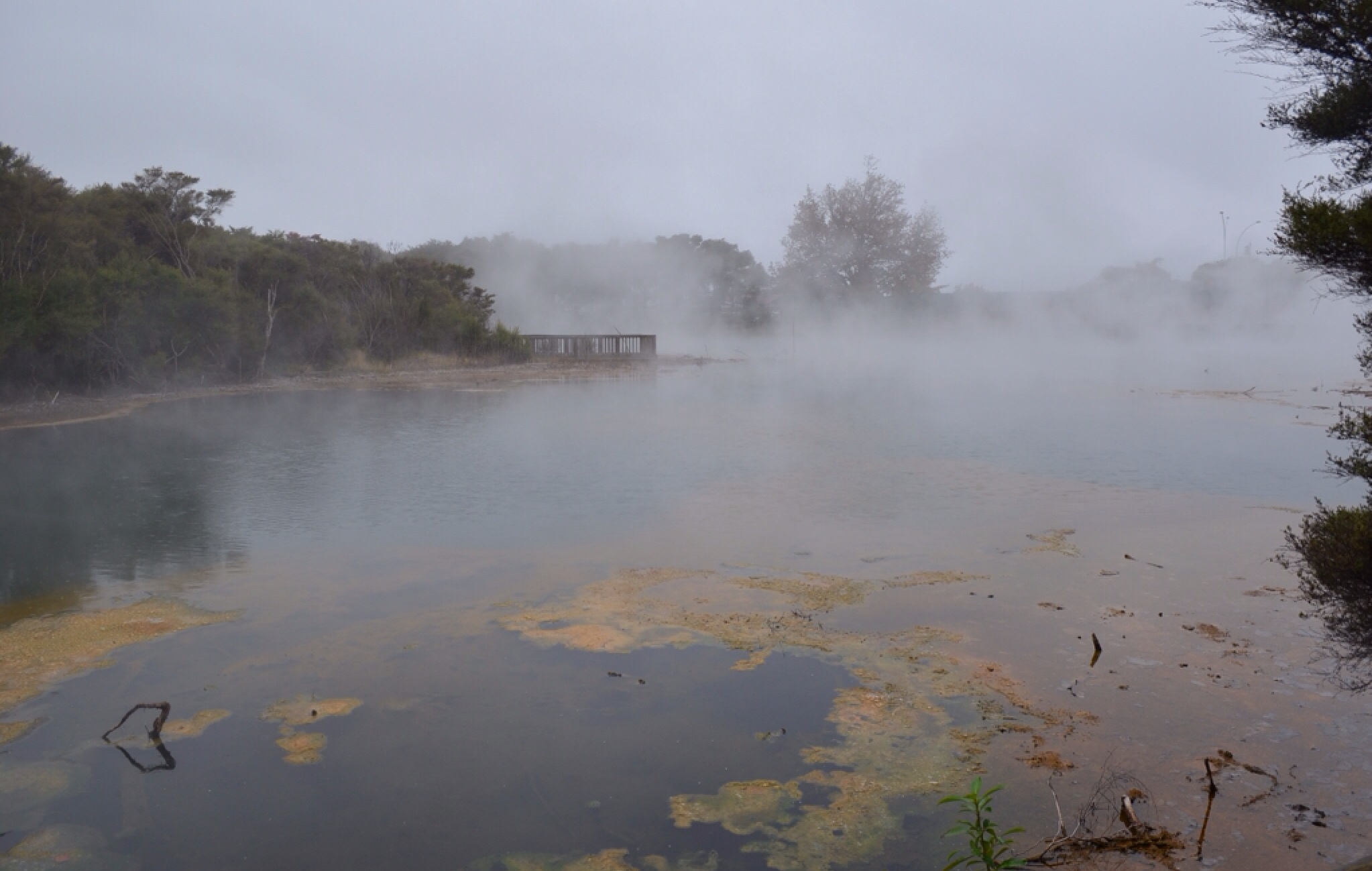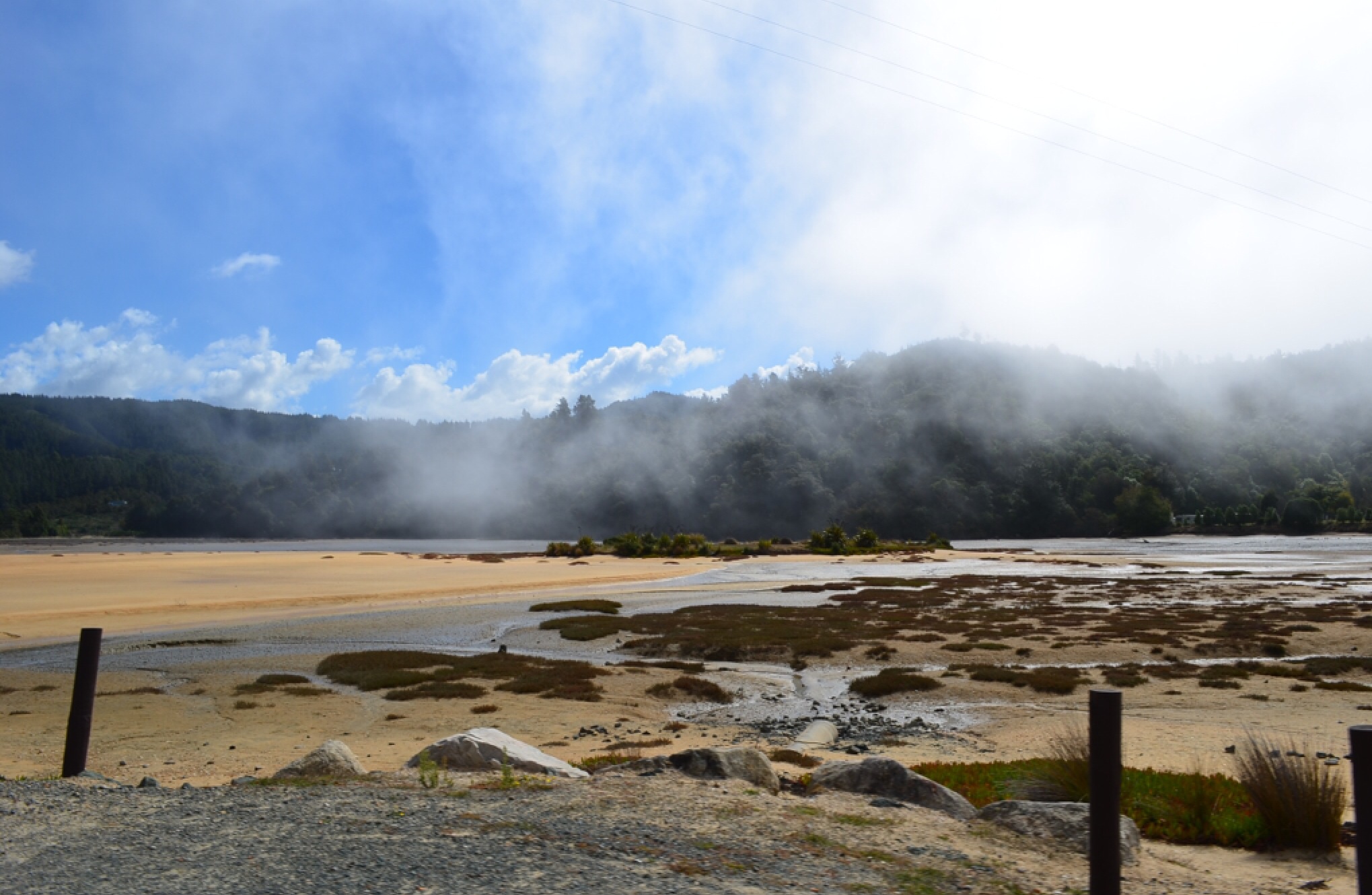 Dat de Kiwi’s trots zijn op hun natuur is terecht. Het landschap kenmerkt zich door spectaculaire geologische verschijnselen die in Nederland niet te vinden zijn. Het meest bijzondere op het Noordereiland vond ik het sterk naar zwavel ruikende stadje Rotorua. Rotorua is gebouwd op een op verschillende plekken aan de oppervlakte komend zwavelmeer. De tientallen kokende modderbronnen voorzien de stad van een neveldeken, dat vooral in de koele ochtend heel indrukwekkend is. In Rotorua heb ik trouwens ook mijn hechtingen laten verwijderen. Een laatste foto in het ziekenhuis heb ik als aandenken aan dit hachelijke avontuurtje hieronder toegevoegd.